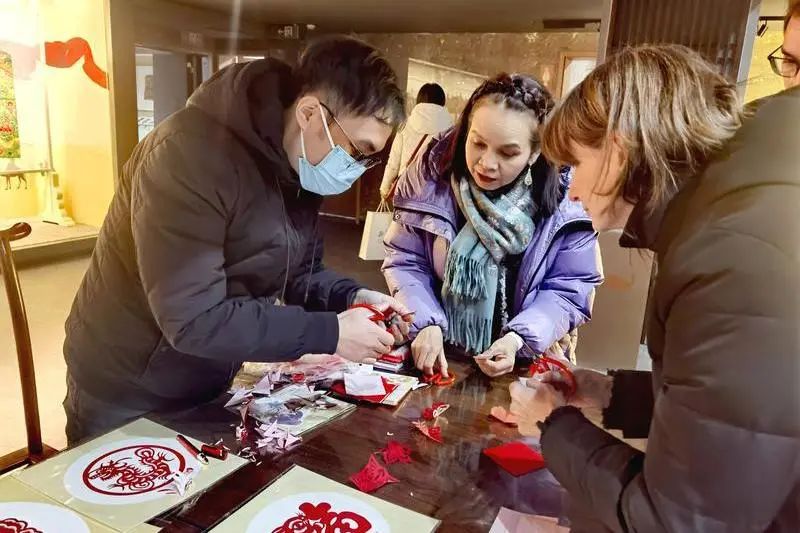 “老师,可以教我剪那个漂亮的窗花吗?”这边,在非物质文化遗产剪纸艺术传承人雷俊指导下,几位外国专家如愿剪出了四叶草、梅花的漂亮图案;那边,几位外国专家换上戏服,在秦腔演员指导下,摆起pose拍照……