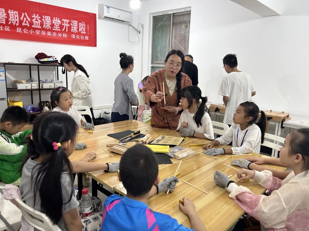 胡家庙街道万东社区新时代文明实践站围绕学龄儿童的兴趣特点,开展了“V爱童行”“木工小课堂”等暑期公益课。在“木工小课堂”上,老师认真耐心地讲解木材的选择与处理、基本木工技术和制作、木工工具的使用等内容。在老师的指导下,孩子们积极参与小组合作,锉削、打磨、拼接……在学习掌握木工加工技能的过程中,体验到了亲手创造的乐趣。