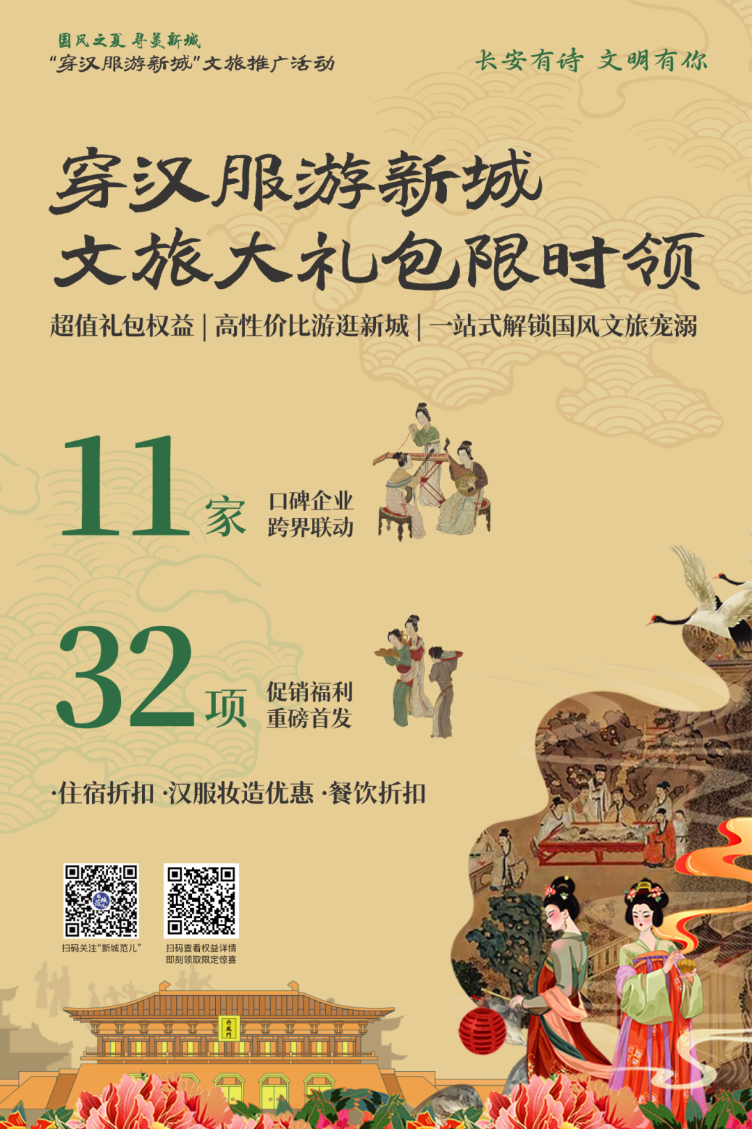 活动内容:联动新城汉服企业、汉服体验场景打卡点、酒店民宿等市场主体,结合暑期、夜间经济消费市场,推出融合妆造优惠、住宿折扣、餐饮打折等促消费措施,吸引广大市民游客领取,享受优惠福利。