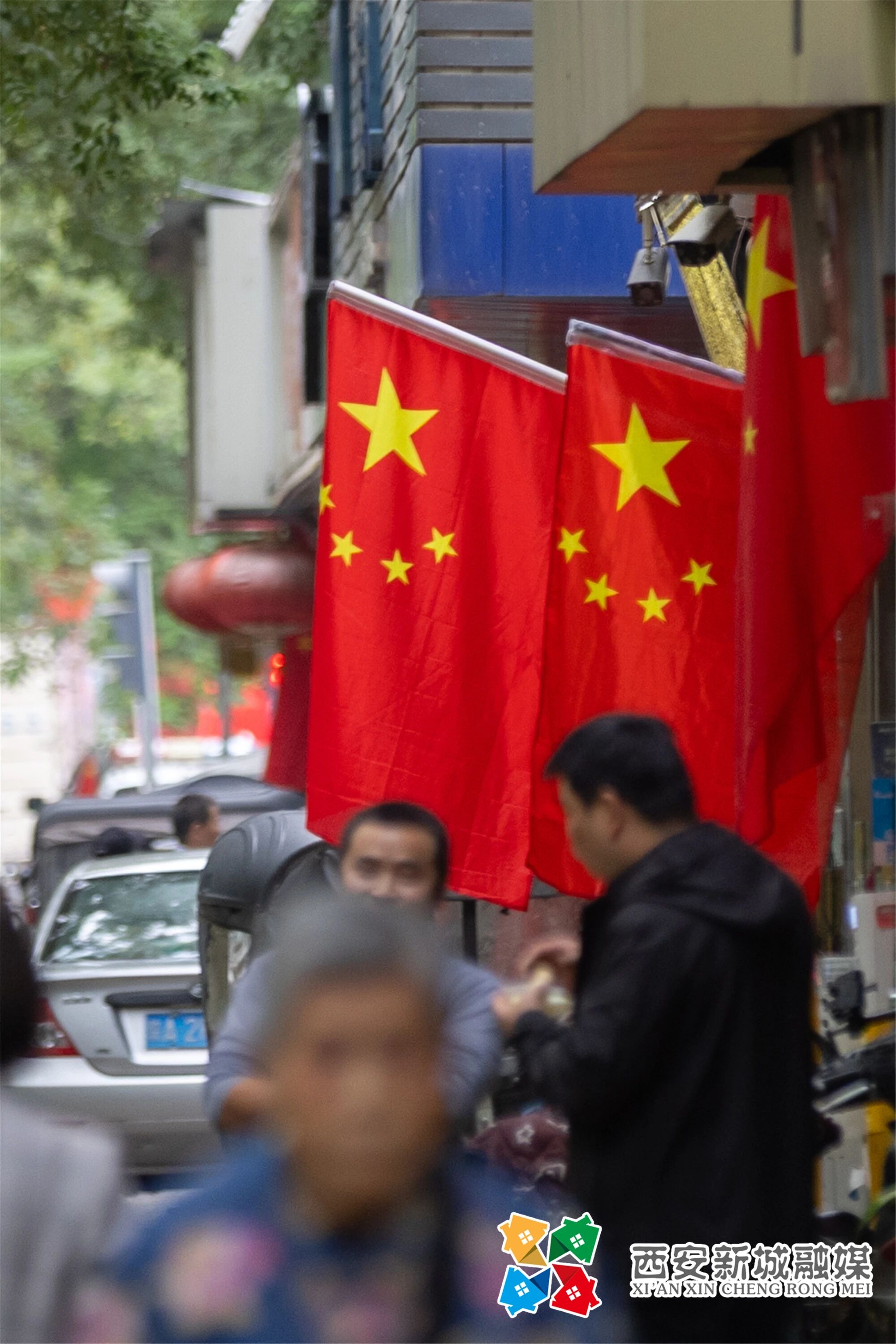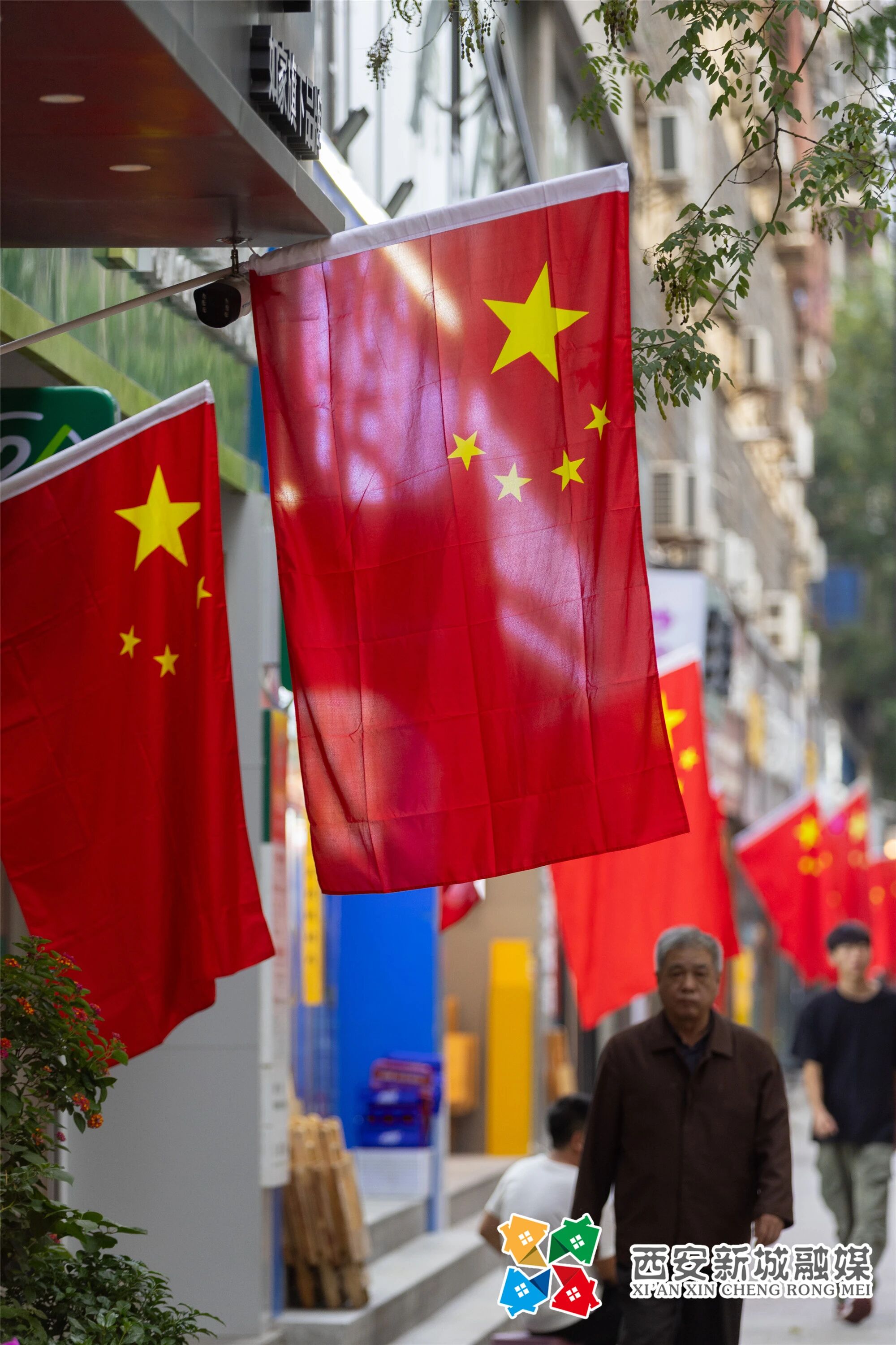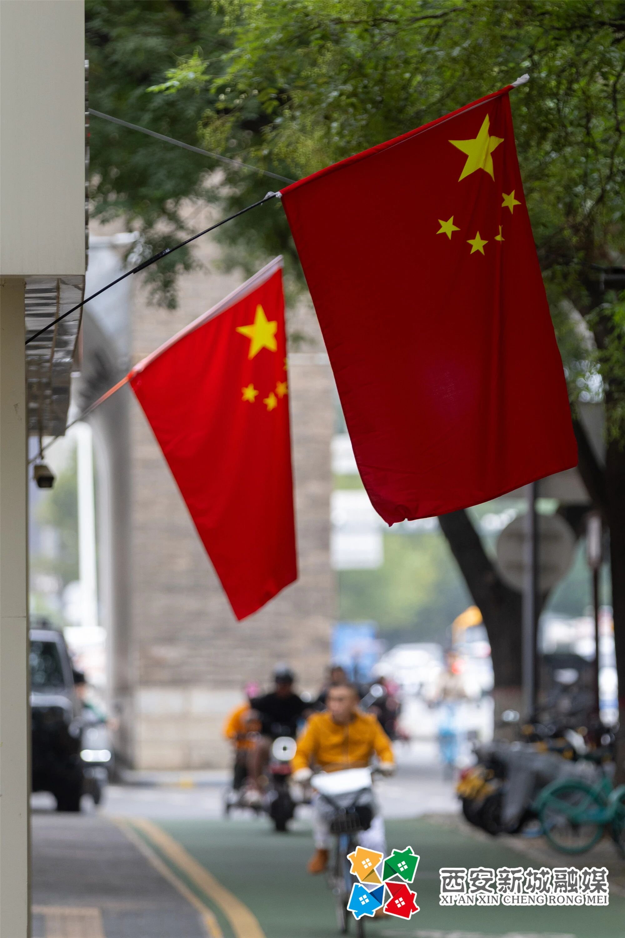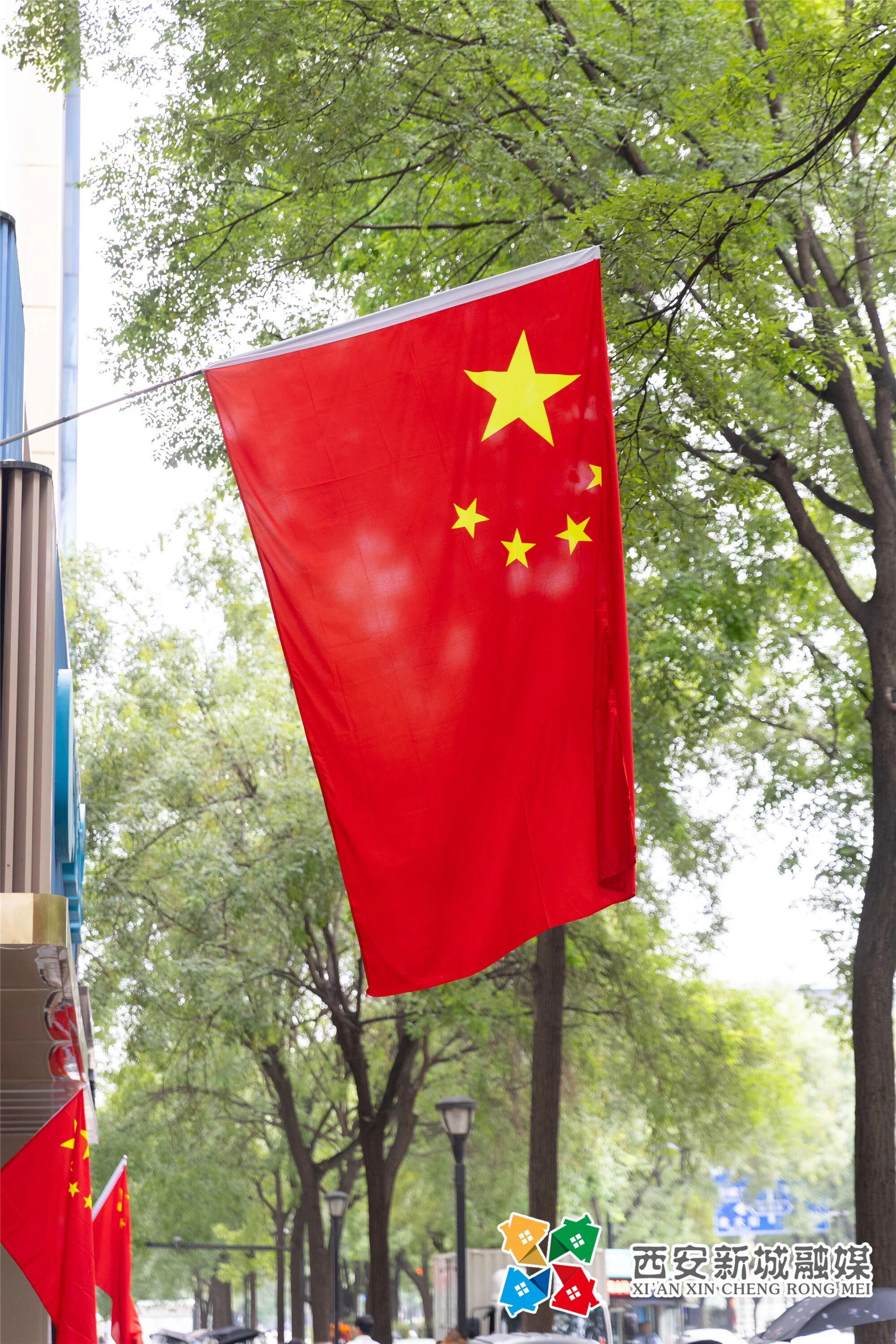 迎风飘扬的五星红旗与街道绿树交织