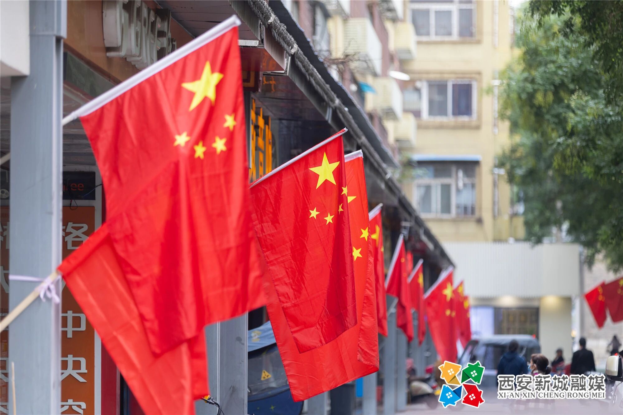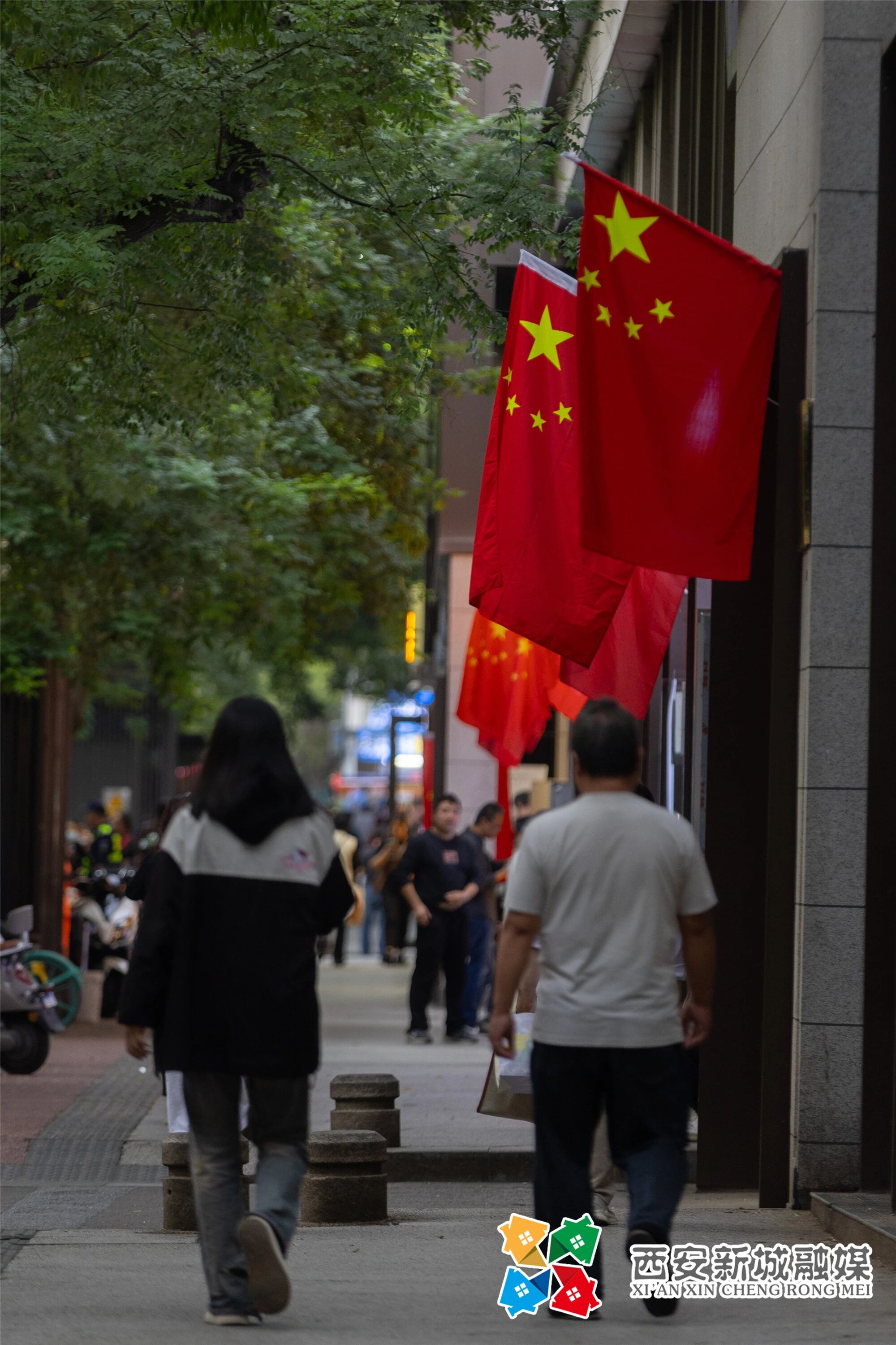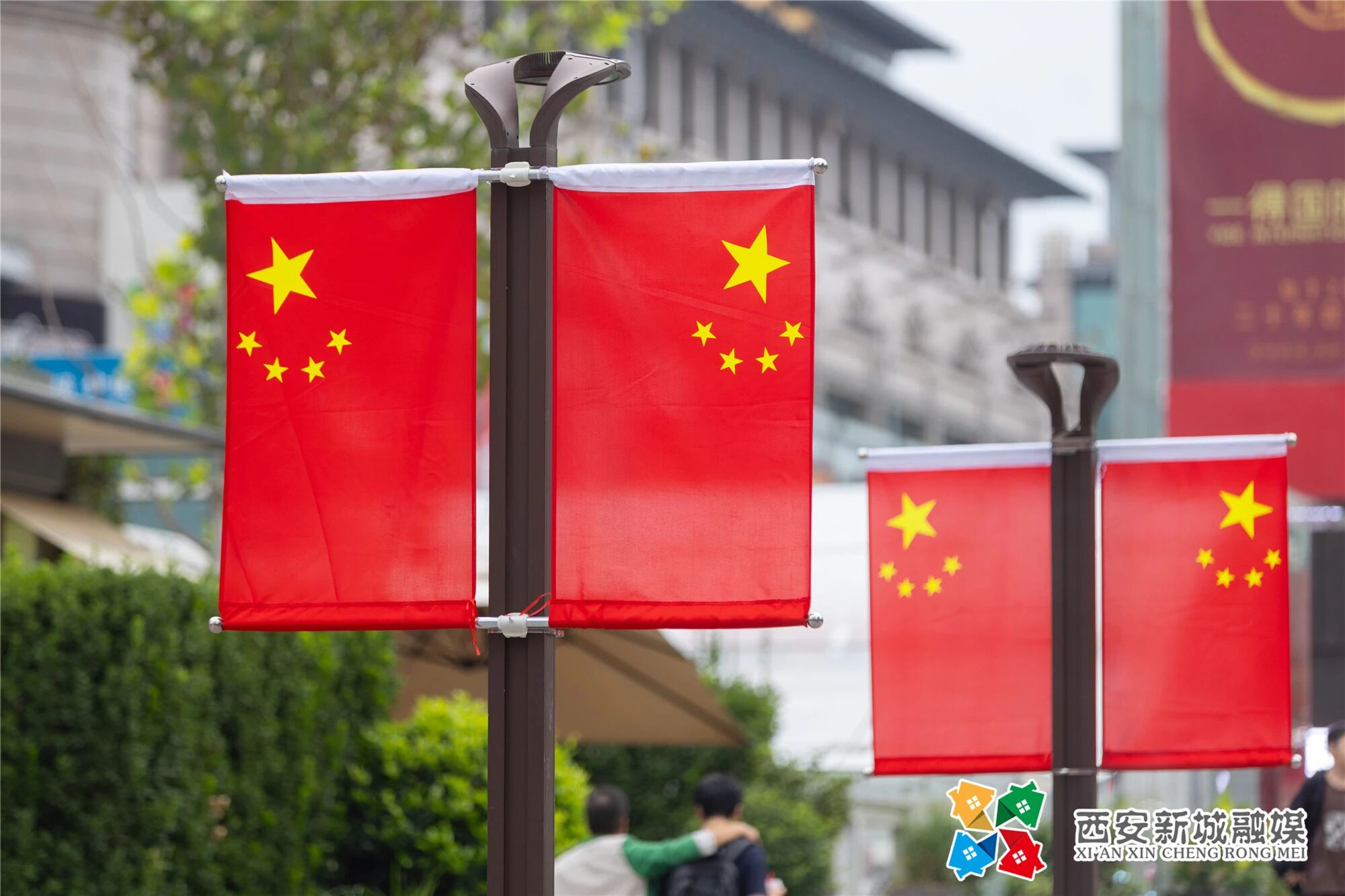 迎风飘扬的五星红旗与街道绿树交织