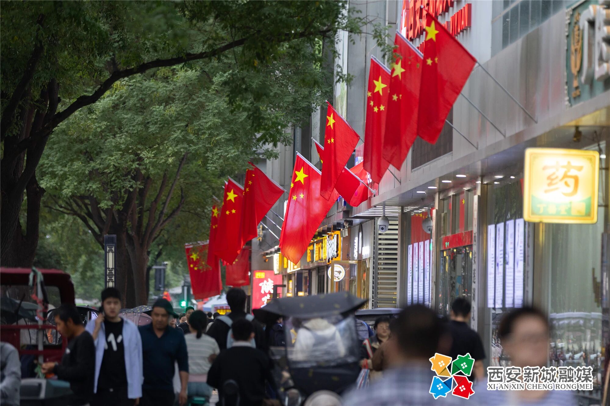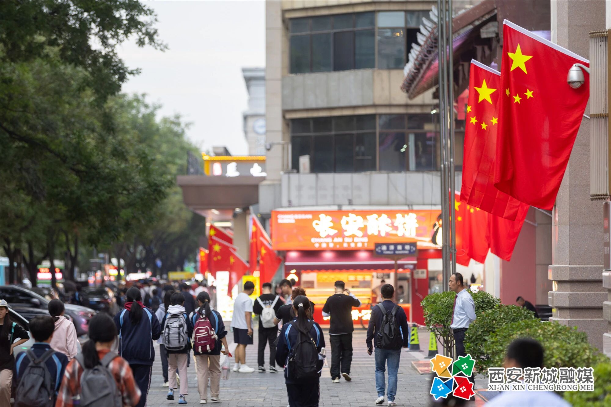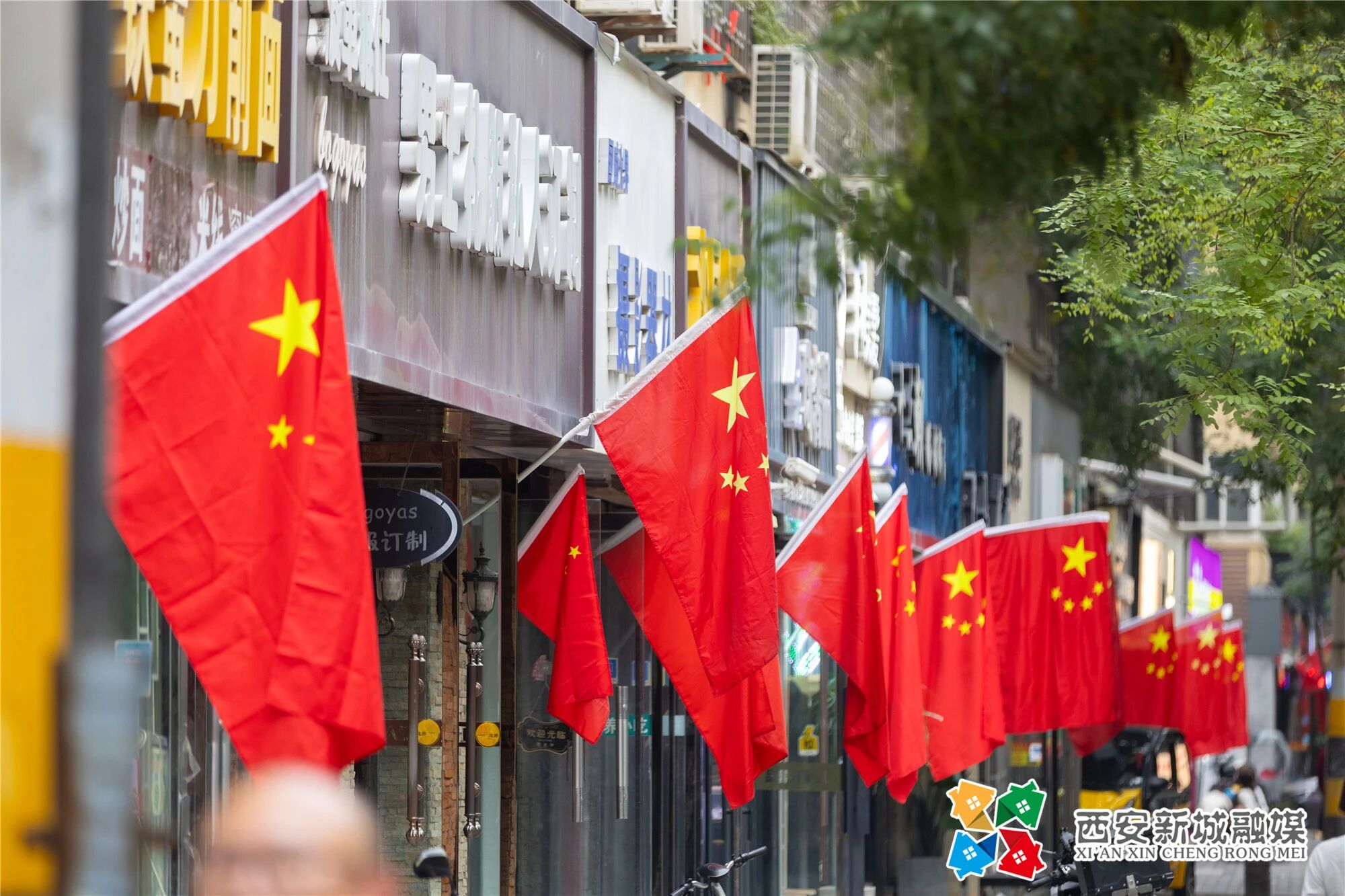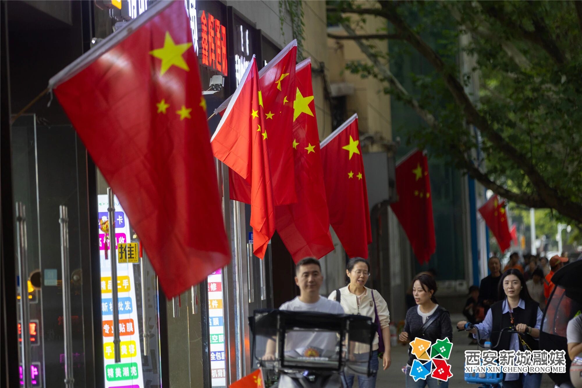 迎风飘扬的五星红旗与街道绿树交织