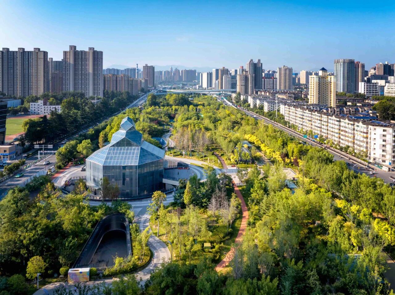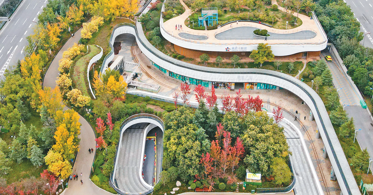 深秋的西安城东,一条绵延5.85公里的“绿色长廊”在阳光下舒展。金黄的银杏叶与苍翠的松柏交织,红绿相间的塑胶跑道和健身设施旁,居民们悠闲惬意地锻炼身体;地下空间,34个“雨滴”天井如散落的珍珠串联起23个下沉广场,逛街的年轻人和听秦腔的大爷大妈共享一片热闹场景……