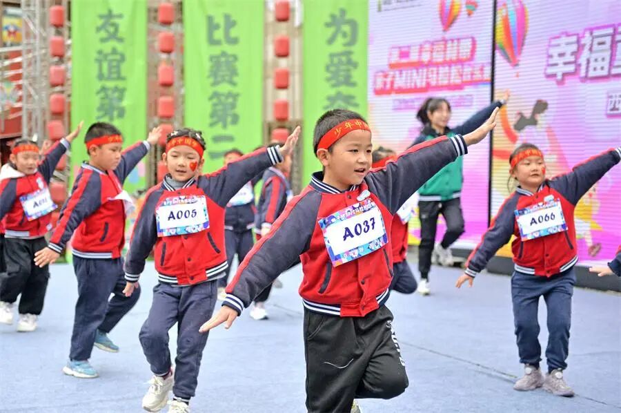 小手拍打、小腰扭动,随着开场律动操《我爱运动》的旋律响起,孩子们在老师带领下尽情舞动,现场瞬间化作欢乐的海洋。家长们头戴各色运动发带,与孩子共同完成热身操《勇气大爆发》,幸福林带被这片跃动的色彩装点得格外生动。