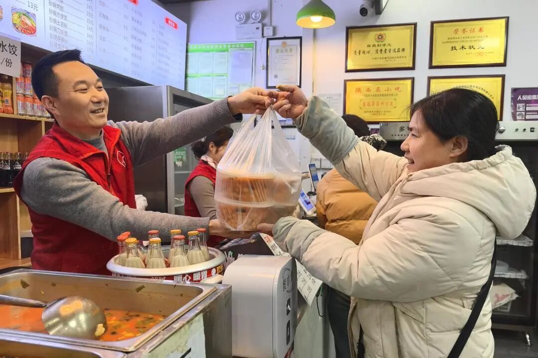 于是,社区召开座谈会,邀请“社区合伙人”共商对策。很快,社区食堂、印象汉阴美食西五路店等4家餐饮店和爱心志愿者积极响应。2024年12月,多方联合启动“周三暖胃行”项目——每周三,每家店免费提供4份定制午餐,专供80岁以上独居老人,志愿者负责配送与陪伴。之后,薛昌利大米凉皮店也积极加入。