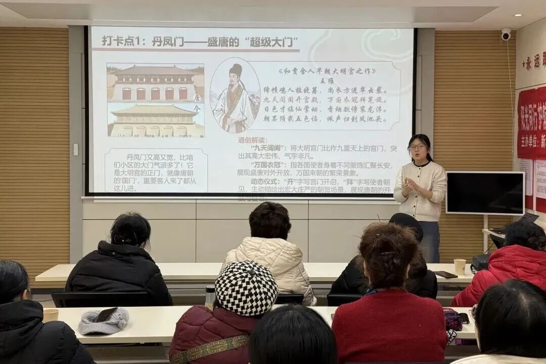 陕西师范大学志愿者以《大明宫“打卡”指南:在唐诗里漫游盛唐第一宫殿》为题,用互动式提问点燃现场氛围:“盛唐国门丹凤门、帝国大厅含元殿、宫廷‘欢乐场’麟德殿,大家今天想先逛哪个打卡点?”“都想去咋办?”“抽签决定吧!”亲切的互动瞬间拉近了与群众的距离。