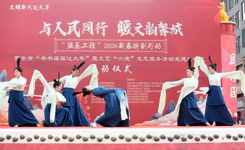 为弘扬中华优秀传统文化,丰富人民群众春节期间的精神文化生活,营造欢乐、祥和、喜庆的节日氛围,2月6日,新城区联合陕西省传统文化发展促进会、西安市书协、西安市美协、西安市“文艺两新”联合会、西安市民协等单位,在民乐园文化街片区狮吼广场组织开展了“强基工程”2026新春特别行动——“与人民同行 暖文韵馨城”西安市“书书福福过大年”暨文艺“六进”志愿服务走进新城区系列活动启动仪式,为新城区春节期间文艺志愿服务系列活动拉开帷幕。